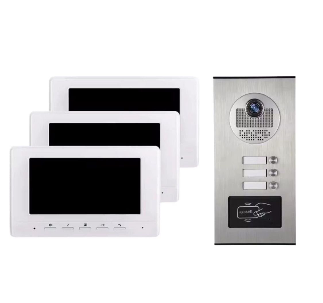 نظام مثالي للشقق والمباني – يدعم حتى 3 شاشات داخلية – مع إمكانية فتح قفل الباب عند التواجد خارج المنزل باستخدام كارت RFID.